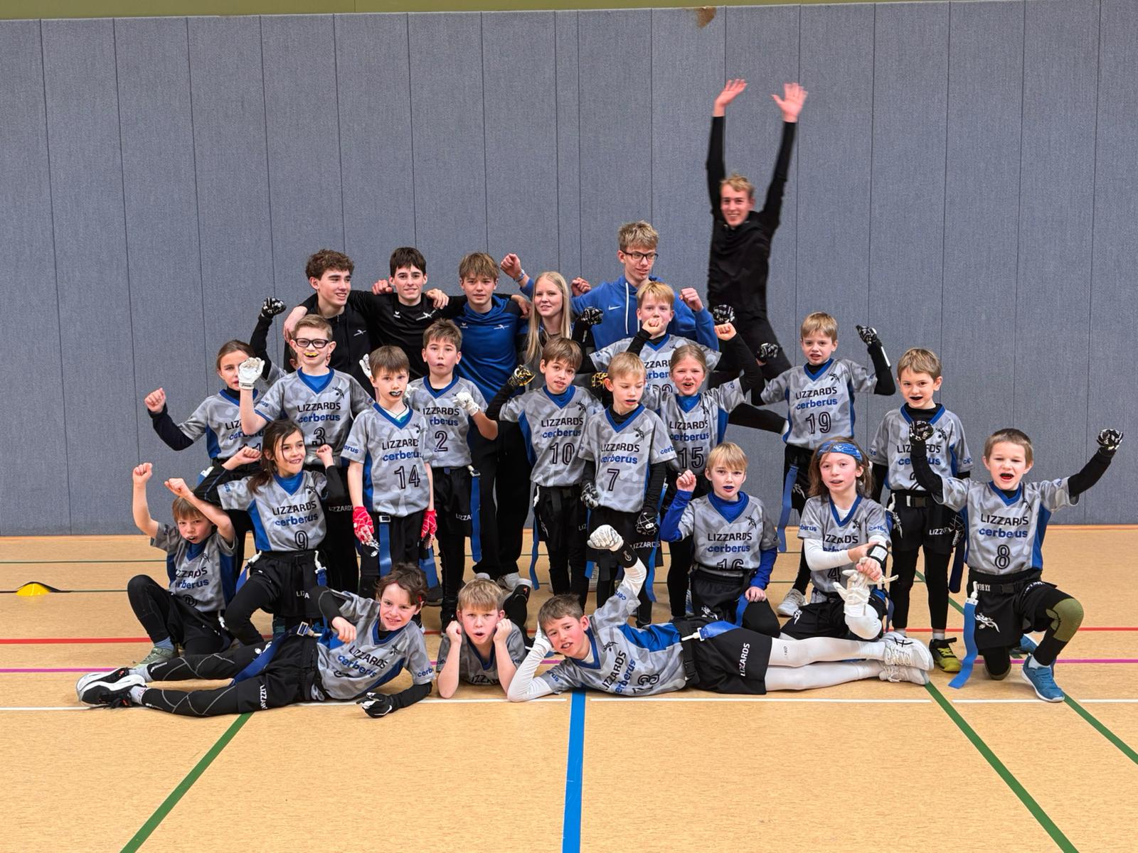Dass die U10 ein echtes Siegerteam ist, bewies sie in Spiel zwei gegen einen weiteren altbekannten Gegner: die Wiesbaden Phantoms. In der Sommerrunde konnten beide Teams jeweils einen Sieg in den direkten Duellen verbuchen, weshalb auch hier Spannung in der Luft lag. Die jungen Lizzards schüttelten die erste Begegnung aus den Knochen und drehten nach einem zwischenzeitlichen 12:12 auf. Der anschließende 13 Punkte-Vorsprung war jedoch noch kein Grund zu feiern, denn Wiesbaden hatte zu diesem Zeitpunkt einen Scorer mehr auf dem Zettel. Darauf reagierten die Lizzards mit einigen Umstellungen. Die Phantoms kamen punktemäßig in der Folge noch einmal heran und beim Stand von 40:32 für die Lizzards bei 2:3 Scorern kam Nervosität bei den mitgereisten Anhängern auf. Immenser Druck lastete nun auf unserer Offense, die danach strebte, den Abstand zu vergrößern und gleichzeitig vor allem die Scorer-Wertung auszugleichen. Schon innerhalb der ‚two-minute-warning‘, gelang im vierten und letzten Versuch die befreiende Eroberung eines neuen und so wichtigen ‚first down‘! Die Offense formierte sich und suchte jetzt die Entscheidung: weiter Wurf in die Endzone, aber fast ‚intercepted‘ durch die Phantoms! Doch mit der Ruhe eines kampferprobten Boxers setzte die U10 im zweiten Versuch den erlösenden finalen ‚Punch‘: Touchdown und Ausgleich im Scorer-Verhältnis! Noch einmal musste die Defense aufs Feld: jetzt bloß keine Punkte oder gar mehr zusätzliche Scorer hinnehmen… Und auf unsere Verteidigung war Verlass: mit einer aufmerksamen Passverteidigung beendeten die Lizzards das Spiel bei 46:32 und 3:3 Scorern (Wertung somit 3:1 für Kelkheim).